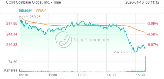 Coinbase 股價周四下跌 6.5%,至239.28美元;而在周三,該股曾上漲 1.3%。