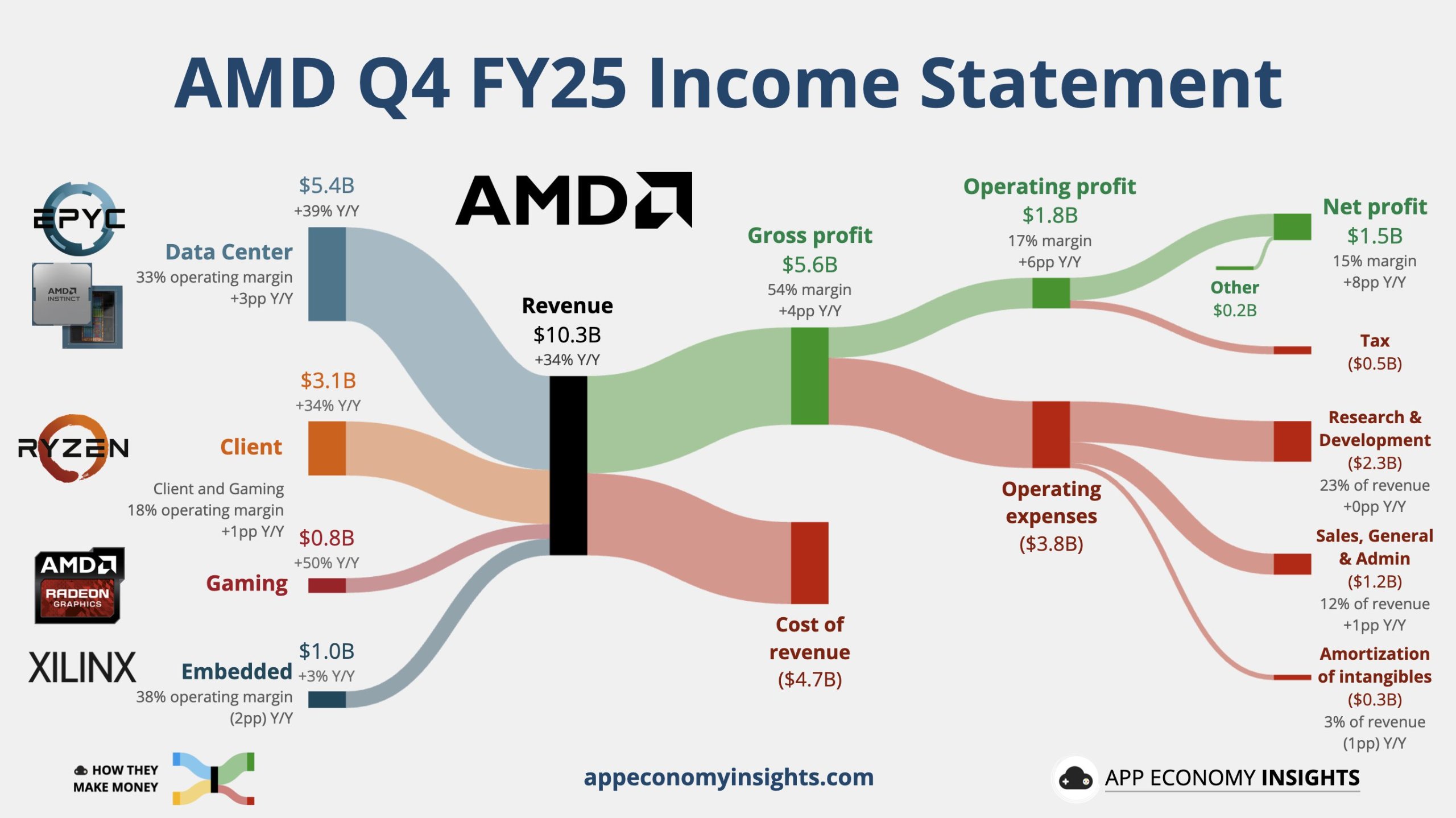 客戶端與遊戲業務也貢獻了約 39億美元的營收,按年增長37%,增速較三季度的73%放緩。當季該業務保持韌性。結合 Ryzen/Radeon 的市場表現,公司在消費者端仍有定價與市佔優勢,進一步穩固現金流基礎。