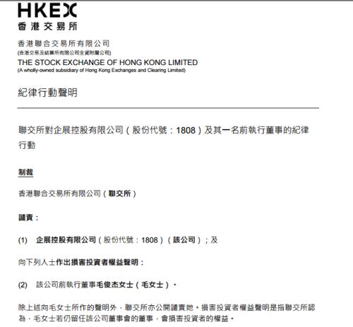 近日企展控股(01808.HK)前執行董事毛俊傑遭聯交所公開譴責,引起熱議。因為這位執行董事還有一個備受關注的身份――女明星、《乘風破浪的姐姐》第三季的選手。
