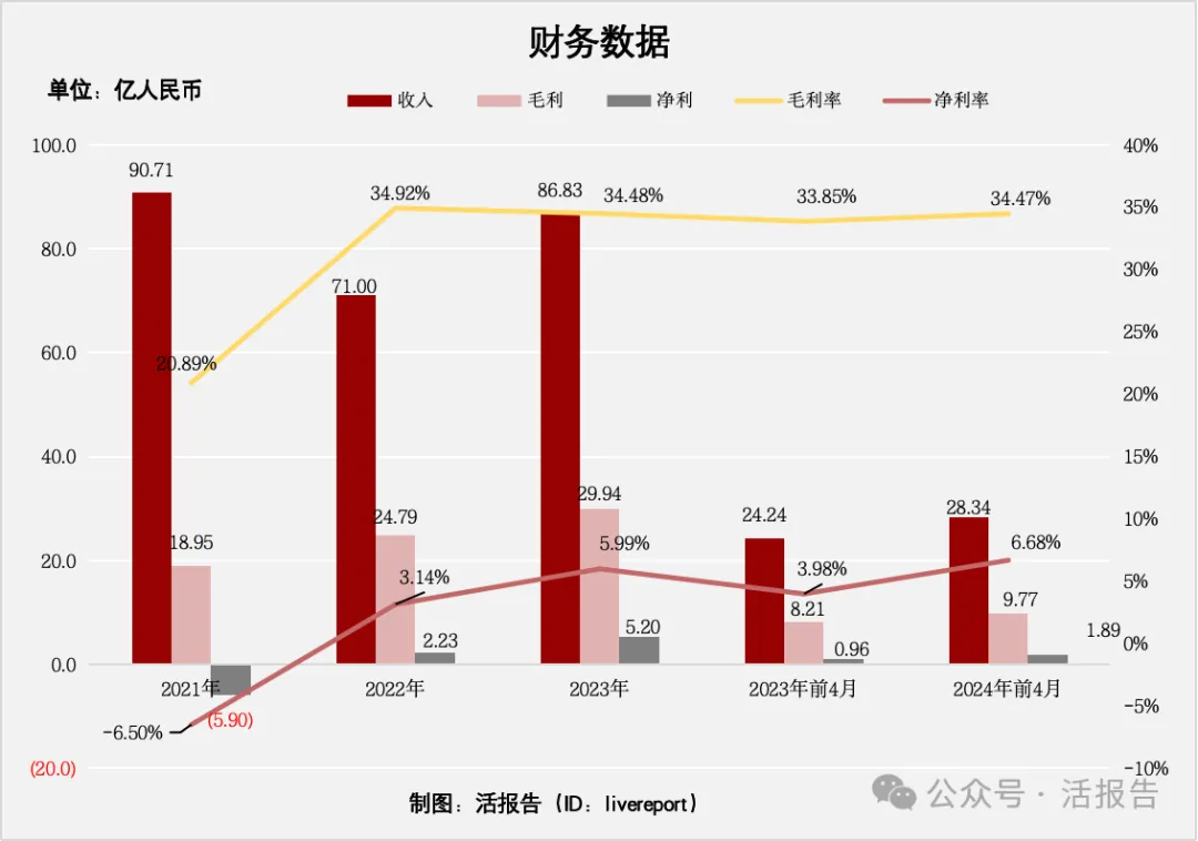 淨利潤分別約為人民幣-5.9億元、2.23億元、5.2億元、0.96億元及1.89億元,2022年扭虧為盈,2024年前4個月同比增長96.2%;
