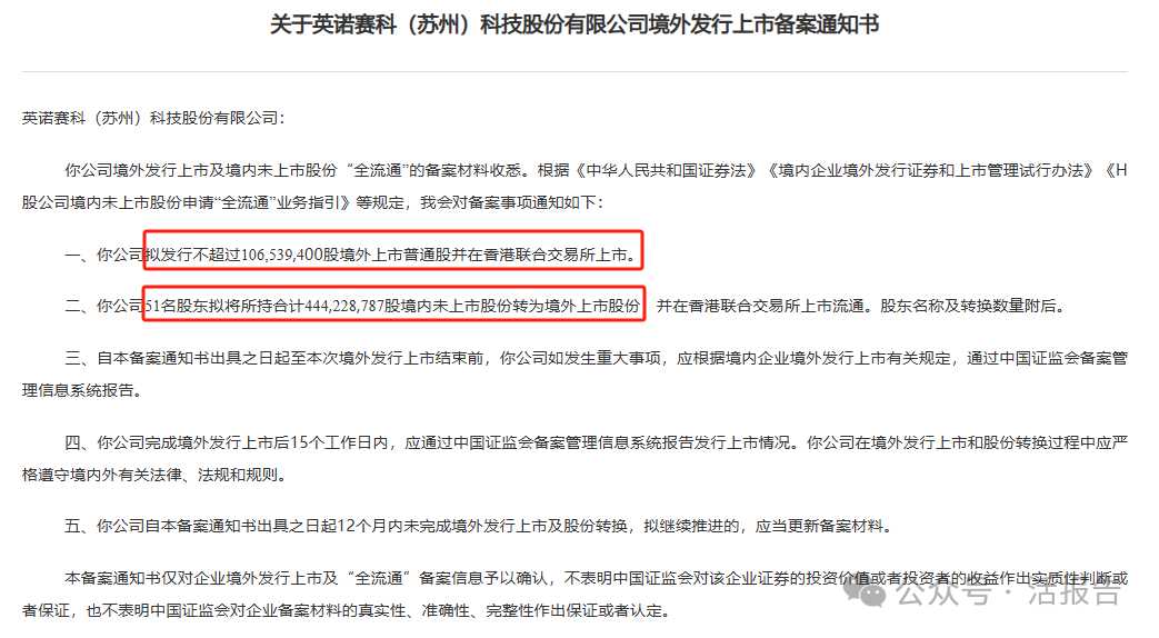 公司擬發行不超過1.07億股境外上市普通股並在香港聯合交易所上市,且擬將51名股東擬將所持合計約4.44股境內未上市股份轉為境外上市股份。