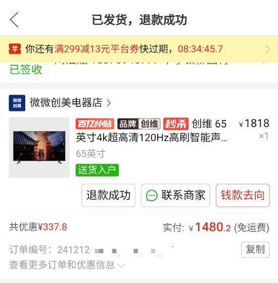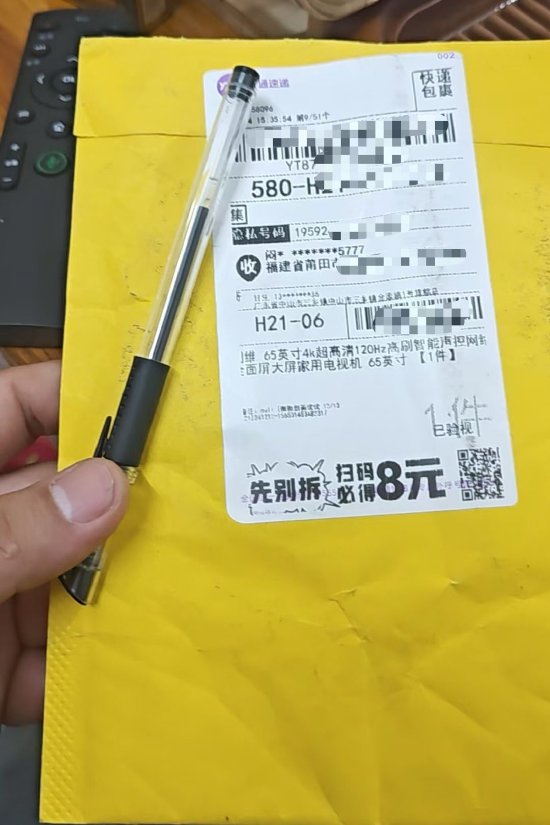 福建的盧先生投訴稱,12月12日,自己在拼多多「微微創美電器店」花1480.2元購買了一台65英寸的創維電視。發貨前客服給他發送了一些注意事項,並且正常上傳了物流信息。等到收貨的時候,盧先生卻只收到一支筆。而快遞單面上的標註是「65英寸電視」,且物流單號和平台的物流單號一致,上面顯示「已簽收」。