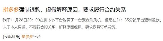 隨後,盧先生向客服詢問原因,但是客服並沒有任何回覆。在他投訴至拼多多平台後,平台給盧先生進行了退款處理,但沒有任何補償。