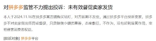 近日,《5D調查》在黑貓投訴 【下載黑貓投訴客戶端】平台發現,有消費者投訴拼多多商家存在虛假髮貨、欺詐消費者的問題。