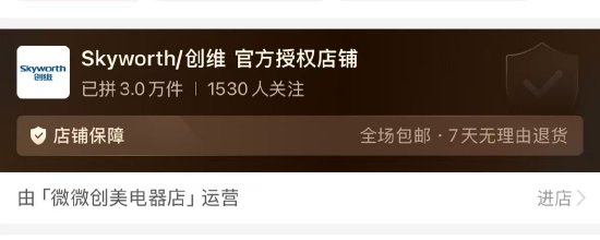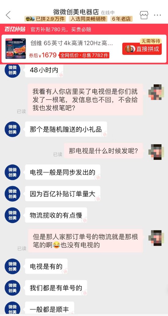 《5D調查》搜索拼多多發現,「微微創美電器店」顯示為「創維官方授權店鋪」,由「微微創美電器店」運營。在詢問同款電視發貨時間時,客服表示48小時內發貨。被問及盧先生的情況時,客服稱「筆是隨機贈送的小禮品,電視也是同步發出,只是攬收有點慢。」