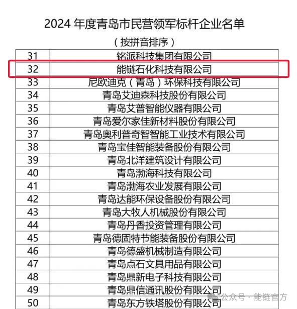 近日,青島市民營經濟發展局公佈了2024年度青島市民營領軍標杆企業名單,能鏈、歌爾科技等198家企業上榜。該排行榜經過區(市)推薦、專家評審、公示等一系列縝密嚴格篩選,具有極高的含金量,是青島加快創建具有全球競爭力的世界一流企業的重要舉措,意在打造民營經濟高質量發展標杆示範,推動更多企業衝擊全國民營500強。