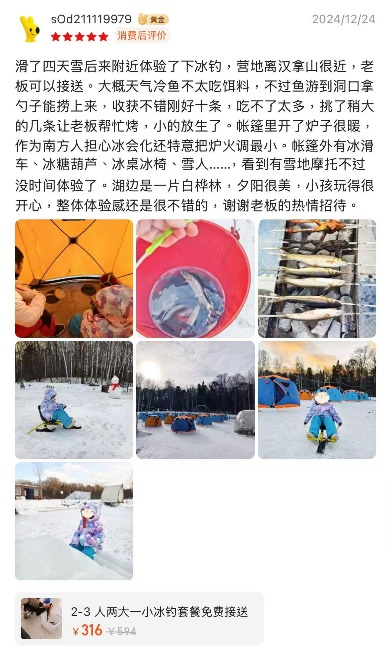 「滑完雪來體驗冰釣,營地離雪場近,老闆可以接送,作為南方人還擔心爐火會把冰烤化」「是南方人完全沒體驗過的」「雪屋裏很冷,得穿多一點」評論區內,多個遊客分享自己滑完雪後的奇特體驗和攻略和評價。