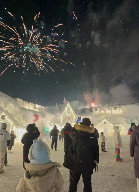 ▲遊客們正穿着羽絨喫火鍋,在雪屋外賞煙火。/圖源:美團app