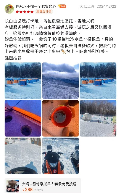 除了趙女士經營的雪屋火鍋,在「長白山萬達雪場」附近,雪地火鍋、冰釣中心、圍爐煮茶、雪地摩托等團購套餐同樣熱銷。為應對旅遊旺季,多家門店老闆表示將為遊客提供免費專車接送等服務,方便遊客滑完雪後可以「無縫銜接」下一站。