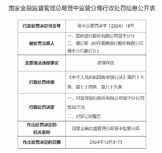 1月10日金融一線消息,國家金融監督管理總局晉中監管分局行政處罰信息公開表顯示,晉商銀行股份有限公司晉中分行因虛增存款,被罰款50萬元。