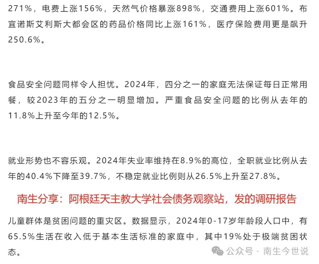 該調研機構還提到:在2024年的阿根廷,大約四分之一的家庭「無法保證每日正常用餐」。在0至17歲的兒童、青少年羣體中,有65.5%生活在收入低於基本生活標準的家庭中。