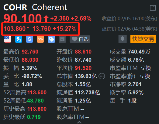 格隆匯2月6日|Coherent(COHR.US)盤前漲超15%報103.86美元。消息上,Coherent25財年第二財季的非GAAP每股攤薄收益為0.95美元,高於去年同期的0.27美元;FactSet調查的分析師預期為0.69美元。對於第三財季,公司預計非GAAP每股收益將在0.75美元至0.95美元之間;FactSet調查的分析師預期為0.76美元。(格隆匯)
