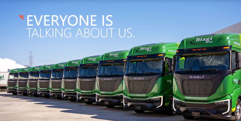 Nikola曾向物流公司BIAGI BROS提供的氫能電池汽車2020年6月,Nikola通過與SPAC公司合併的方式登陸納斯達克。上市時,Nikola的市值33億美元,但在第一天就漲到了130億美元。此後Nikola的股價繼續一路飆漲,在上市的第三天便一舉超過了福特和菲亞特克萊斯勒兩大汽車巨頭。