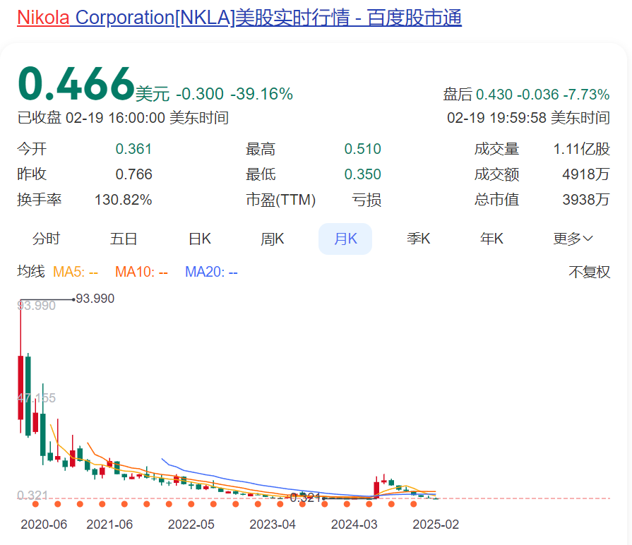 當地時間2月19日,Nikola暴跌,盤中一度跌超50%,截至收盤跌39.16%,報收0.466美元,較2020年高點已跌超99%,約300億美元市值灰飛煙滅(約合人民幣2184億元)。