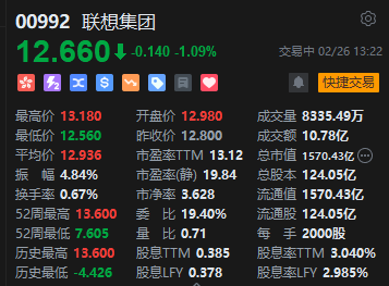 2月26日消息,聯想集團午後股價跳水跌超1%,早盤一度漲近3%。現報12.66港元,成交額10.78億港元。