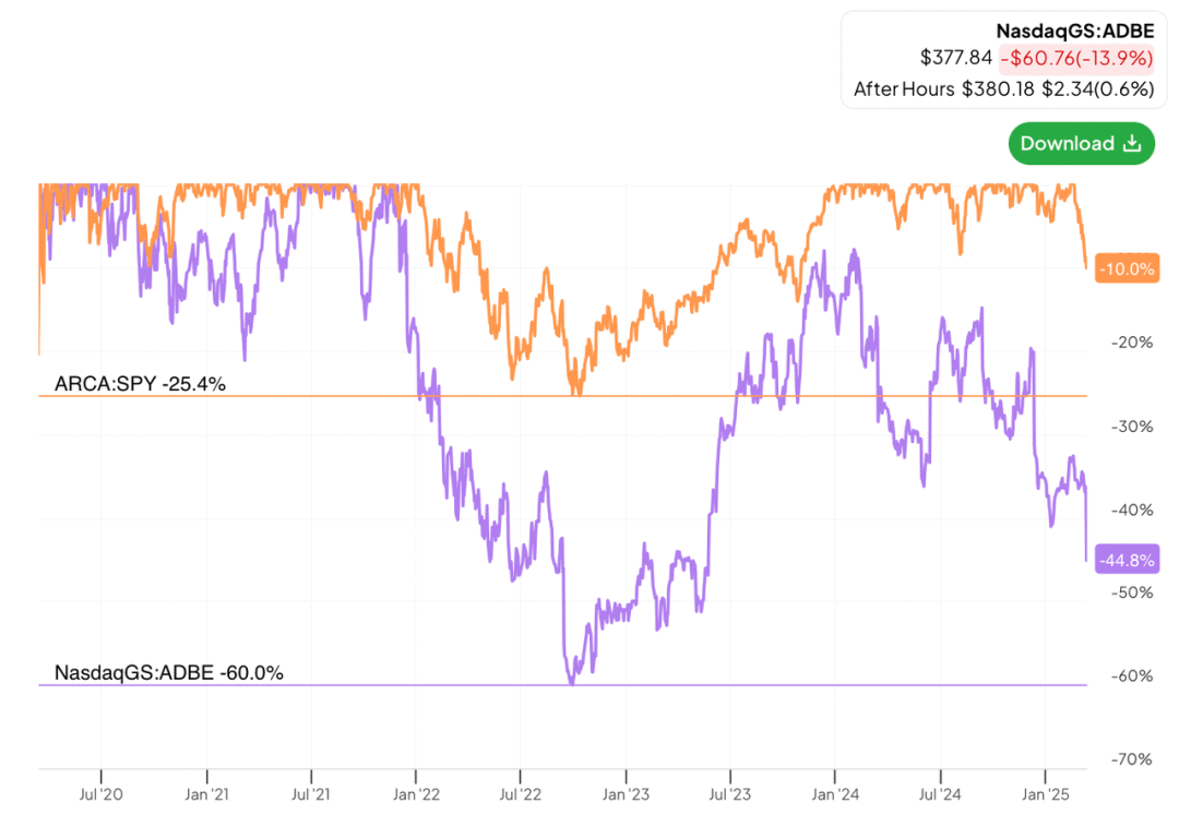 與上個季度一樣,Adobe 的股價在公佈業績後大幅下跌。上週四,該公司股價下跌近 14%,與歷史高點相比仍大幅下跌。該股目前下跌了 40% 以上,是過去 5 年來第二大跌幅。唯一(但很重要)的區別是,當前的下跌與大盤明顯脫節,而 2022 年的下跌並非如此。這隻能意味着一件事:市場認為 Adobe 這次存在根本性問題。