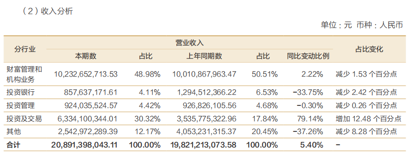 分業務板塊看,2024年,公司財富管理和機構業務、投資銀行業務、投資管理業務、投資及交易業務及其他業務分部收入分別為102.33億元、8.58億元、9.24億元、63.34億元和25.43億元,佔公司營業收入比例分別為48.98%、4.11%、4.42%、30.32%和12.17%。
