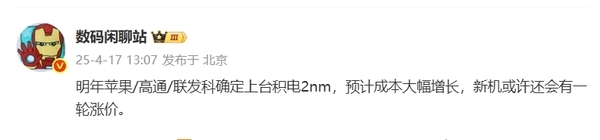 4月17日消息,微博爆料達人@數碼閒聊站發博表示,蘋果將在明年iPhone機型中採用臺積電2nm工藝。當然除了蘋果,另兩家芯片大廠高通以及聯發科也將採用臺積電2nm工藝。他同時預計「成本大幅增長,新機或許還會有一輪漲價」。這也意味着,將於明年發佈的蘋果iPhone 18系列將採用臺積電2nm製程打造新一代A20芯片。儘管這項技術突破將帶來顯著的性能與能效提升,但也可能導致成本激增,最終轉嫁給消費者...