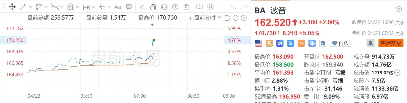 格隆匯4月23日|波音盤前上漲超5%。波音2025年Q1營收195億美元,同比增長18%,市場預期194.05億美元,去年同期165.7億美元;第一季度調整後自由現金流為-22.9億美元,市場預期為-34.2億美元。