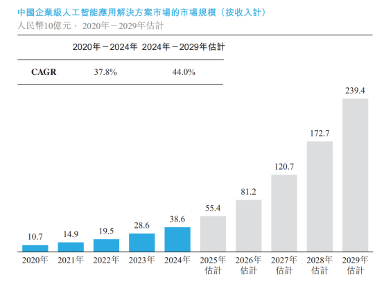 人工智能向商業化落地轉變的同時,企業級人工智能應用解決方案市場規模也水漲船高。弗若斯特沙利文數據顯示,企業級人工智能應用解決方案市場的市場規模已從2020年的107億元(人民幣,下同)增長至2024年的386億元,而2020至2024年的CAGR為37.8%。預計市場規模將在2029年達2394億元,而2024年至2029年的CAGR將進一步增長至44.0%。