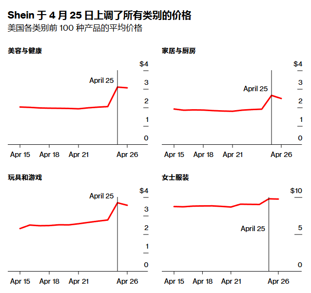 雖然大範圍的價格調整發生在週五,但部分商品此前已開始提價。4月22日,Shein平台上數十款女士服裝類熱銷產品的價格上漲,使該品類前100名商品的平均價格從8.68美元上升至9.06美元,漲幅超過4%。