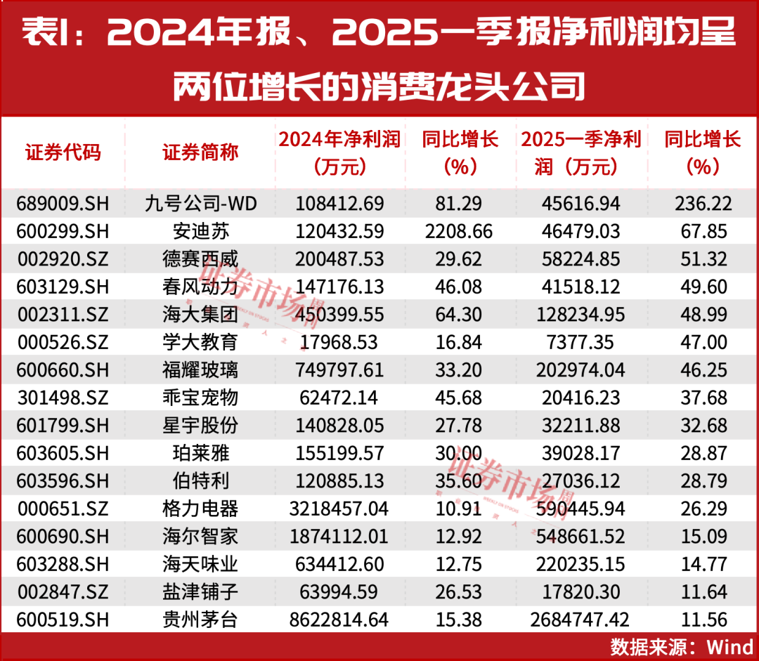 A股公司中,也有多家消費龍頭業績表現不俗,2024年年報、2025年一季報歸母淨利潤同比均實現了雙位數的增長(見表1)。