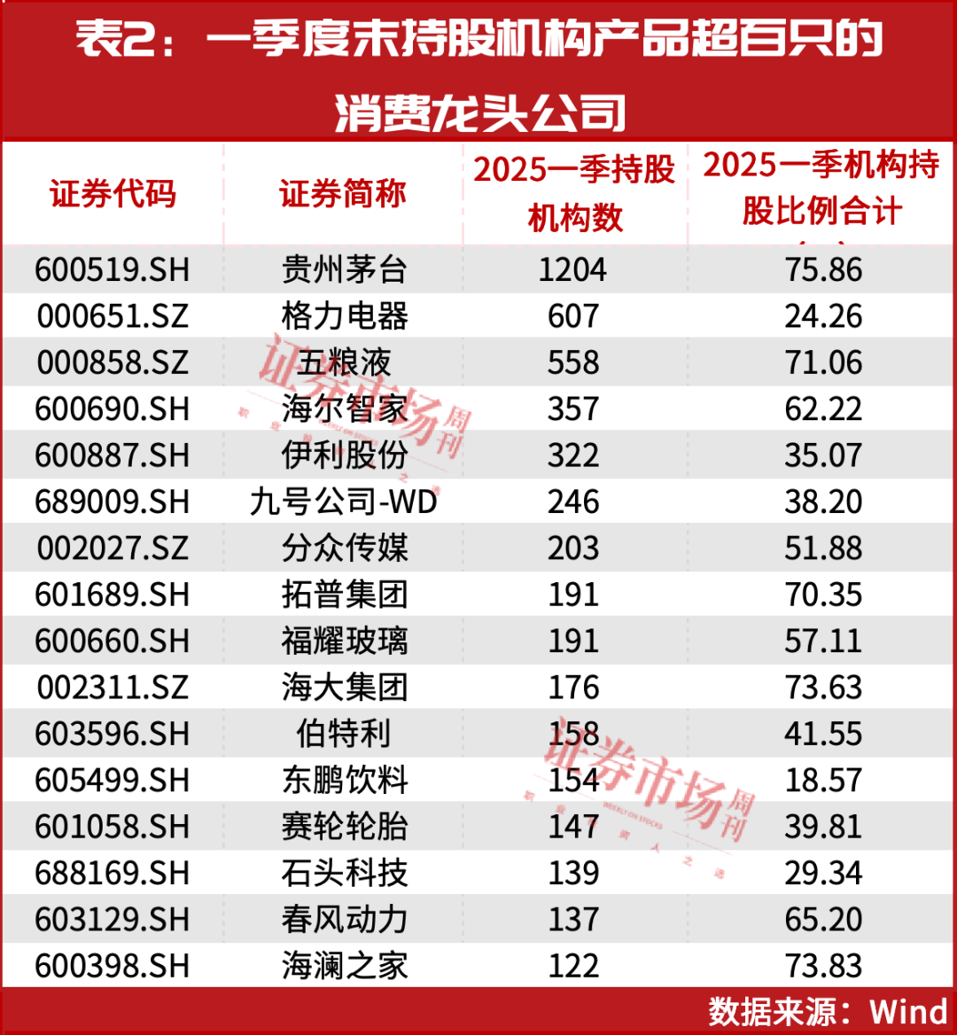 另外,隨着財報的披露,各大機構一季度末的持倉也隨之浮出水面,多家消費龍頭公司被機構資金高度青睞。統計顯示,同時將貴州茅台納入前十大重倉股的機構產品合計1204只,格力電器、五糧液、海爾智家、伊利股份等公司的持股機構產品也均超過了百家(見表2)。