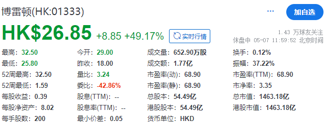 截至午間收市,博雷頓每股報26.85港元,大漲49.17%,總市值約101.94億港元。