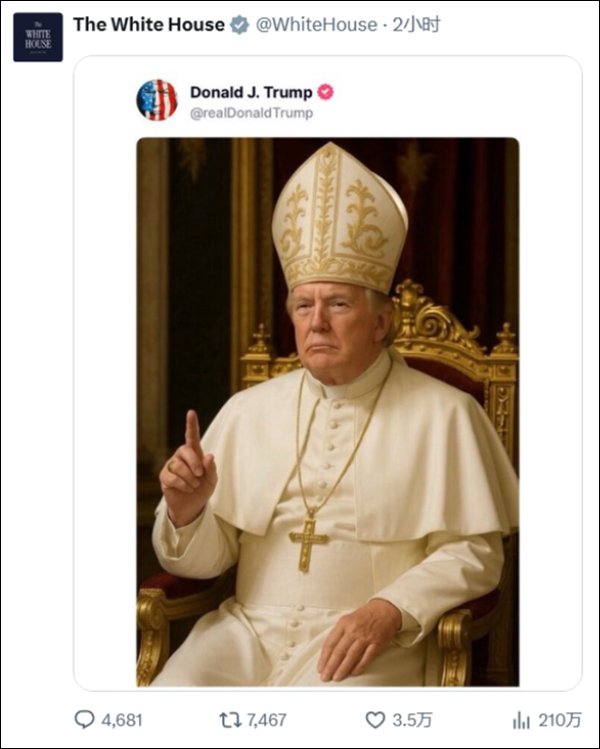 但5月2日,似乎還沒有死心的特朗普又在他的社媒賬號發佈了一張他身着教皇服的圖片,白宮隨後也轉發了這張被一些人稱為「特朗普教皇」的圖片。