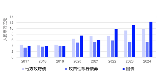 擴大發行規模和提高流動性:中國地方政府債市場規模穩步擴大。截至2025年2月底,地方政府債的未償還票面金額達48.1萬億元人民幣,佔中國在岸債券市場總額的32.1%,超過中國國債的34.9萬億元人民幣以及中國政策性銀行債券的26萬億元人民幣。地方政府債的年度發行量由2022年的7.4萬億元人民幣增加到2024年的9.8萬億元人民幣,增幅達32.4%。發行量的增加也推動了二級市場更加活躍,並改善了流動性。