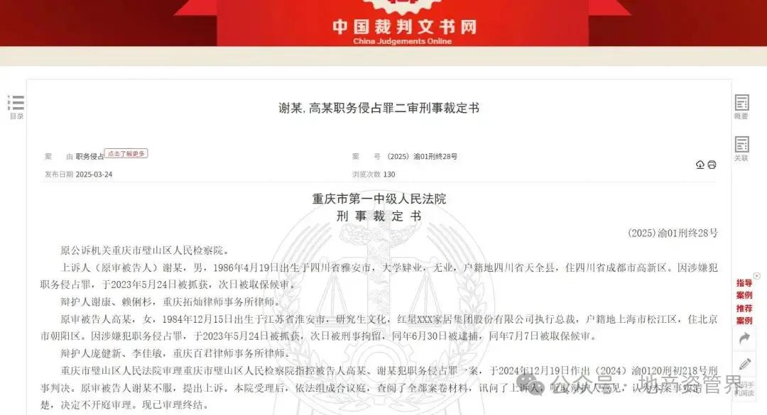 近日,紅星美凱龍原執行總裁高爽職務侵佔案迎來終審判決。