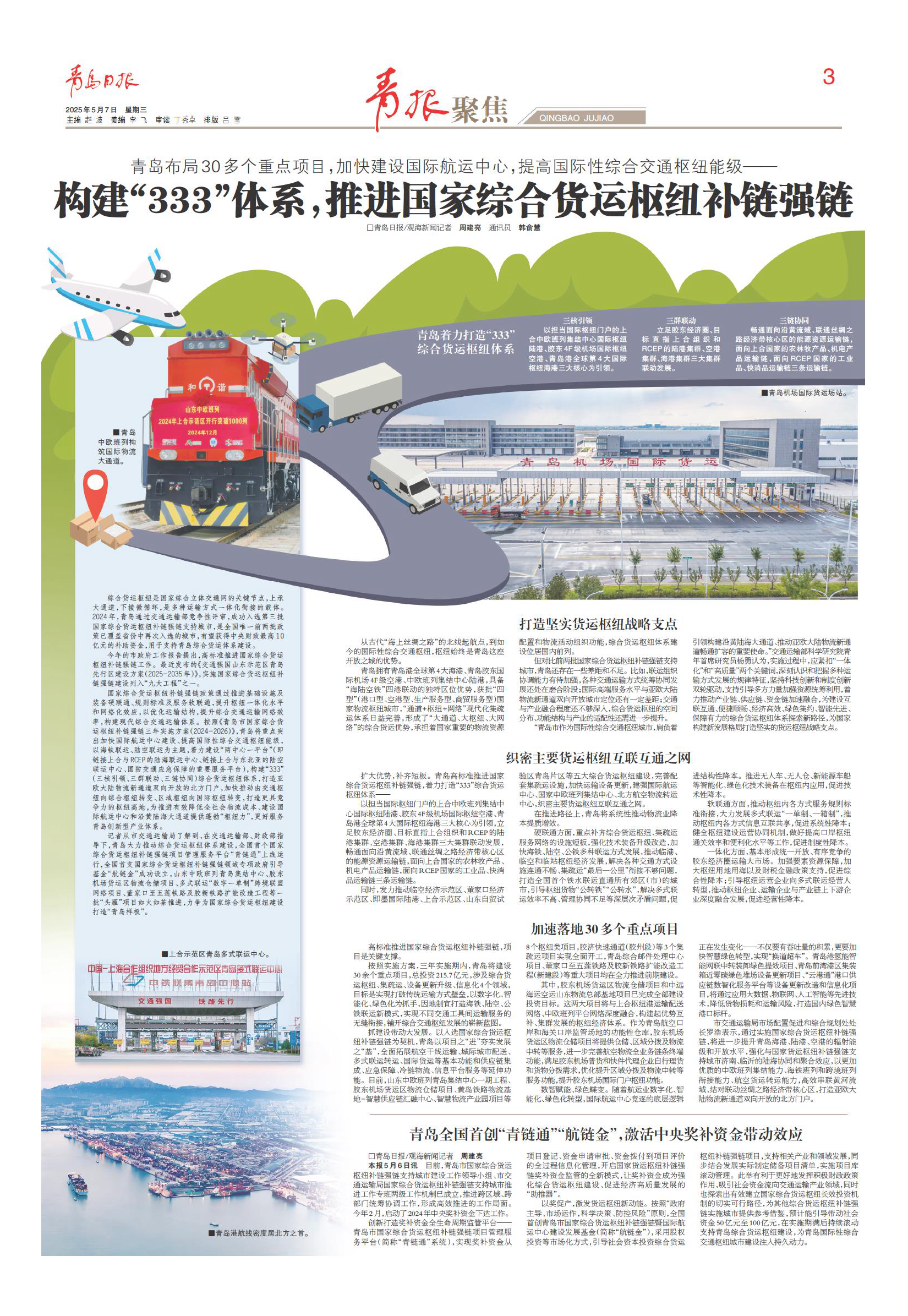 擴大優勢,補齊短板。青島高標準推進國家綜合貨運樞紐補鏈強鏈,着力打造「333」綜合貨運樞紐體系——