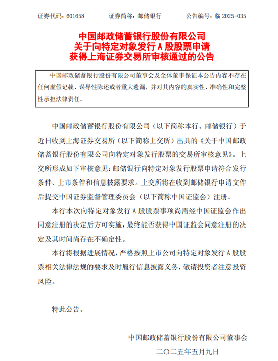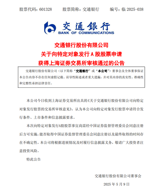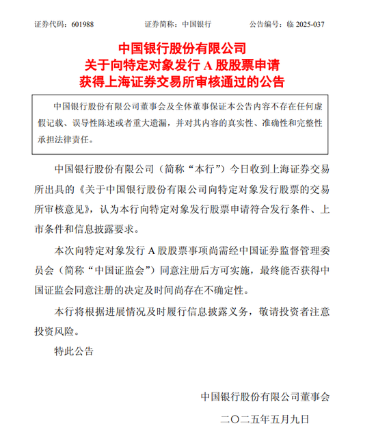 5月9日,中國銀行、交通銀行、郵儲銀行發布公告稱,三家銀行向特定對象發行A股股票的申請均已經獲得上海證券交易所審核通過。