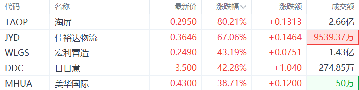 格隆匯5月13日|中概股收盤漲幅前五的個股為:淘屏漲80.21%,佳裕達物流漲67.06%,宏利營造漲43.19%,日日煮漲42.28%,美華國際漲38.71%。(格隆匯)
