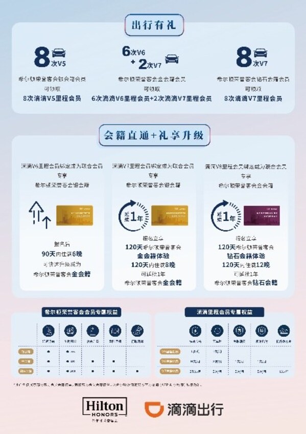 此次戰略合作給雙方會員帶來的權益合作亮點包括:希爾頓榮譽客會會員將根據其會籍等級,獲得滴滴出行的專屬優惠與特權,提升出行便利性。滴滴里程會員將根據會員等級,獲得希爾頓榮譽客會相應會籍,並享受如房型升級、免費早餐、延遲退房等禮遇。[1]