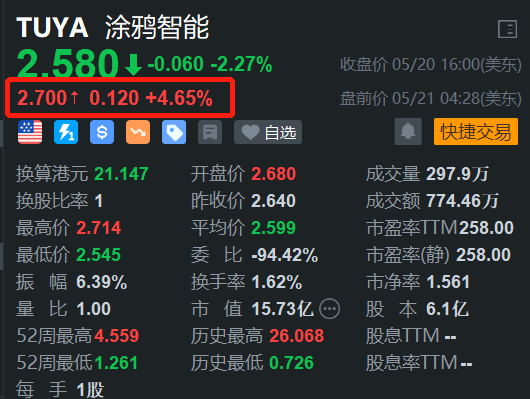 全球雲平臺服務提供商塗鴉智能(2391.HK)盤前漲4.6%。消息上,塗鴉智能Q1總收入為7470萬美元,同比增長約21.1%,高於預期。整體毛利率為48.5%,同比上升0.7個百分點。淨利潤為1100萬美元(2024年第一季度:負350萬美元)。非GAAP每ADS收益為0.03美元,高於預期。