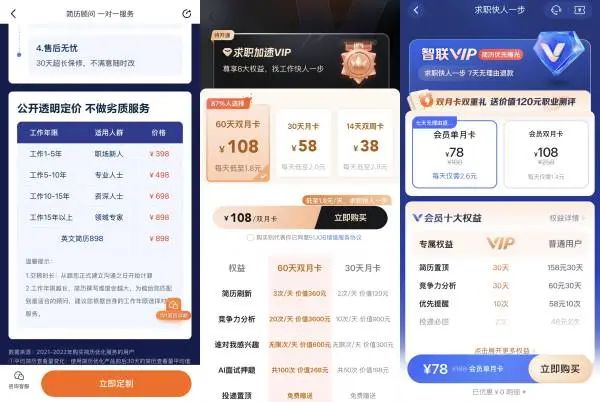 「雖然一些平臺推送很頻繁,但鏈接到的大多是不匹配的公司和職位,」李林還抱怨平臺的C端收費功能雞肋,「當初花68元充的一個月會員,顯示有多重權益,包括簡歷刷新、競爭力分析、優先提醒Boss、專屬簡歷模板、職業性格測評等,但實際上最後用到的也就是簡歷優化,因為修改簡歷的時候必須充會員才能使用他們的模板。」