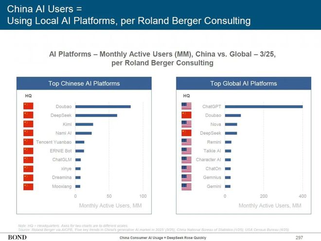 互聯網女皇 Mary Meeker在《趨勢——人工智能》報告中以「競爭白熱化、開源浪潮、中國勢力崛起」為關鍵詞,特別強調了中國AI的崛起。在她列出的中國頭部AI應用中,納米AI位於第四,跟kimi幾乎平行,超越了騰訊元寶和百度文心一言,也是排名最高的搜索引擎。