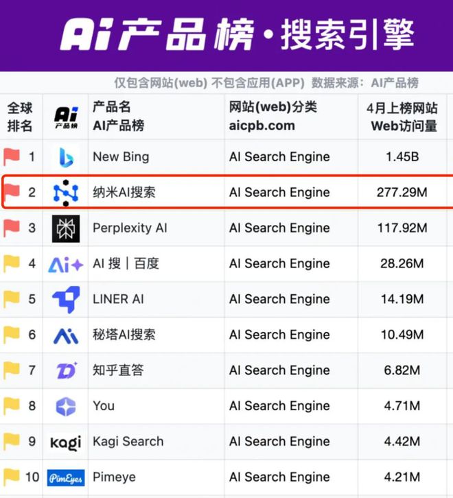 在2025年4月的AI產品榜上,納米AI搜索佔據網站榜AI搜索引擎中國市場第一,全球榜第二。從月度訪問數據上,納米AI搜索也斷崖式領先國內其他AI搜索產品。