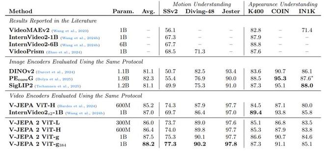 在性能表現方面,V-JEPA 2 展現出了令人矚目的能力。在運動理解方面,該模型在 Something-Something v2 數據集上實現了 77.3% 的 top-1 準確率。