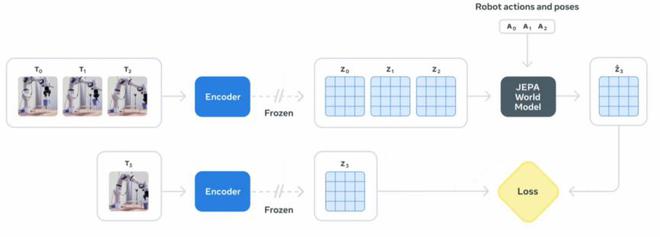 在訓練的第二階段,Meta 專注於利用機器人數據來提升模型的規劃能力。他們向預測器提供動作信息,從而將這些數據整合到 JEPA 訓練流程中。在使用額外數據訓練後,預測器學會了在預測時考慮具體動作,然後可用於控制。