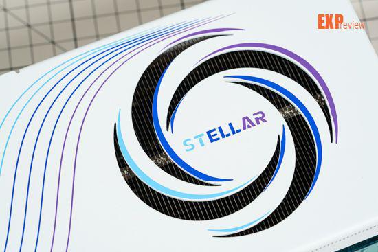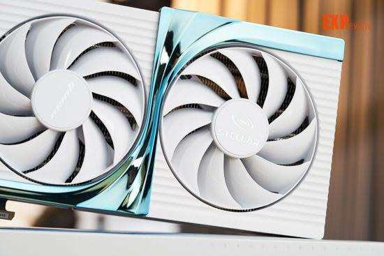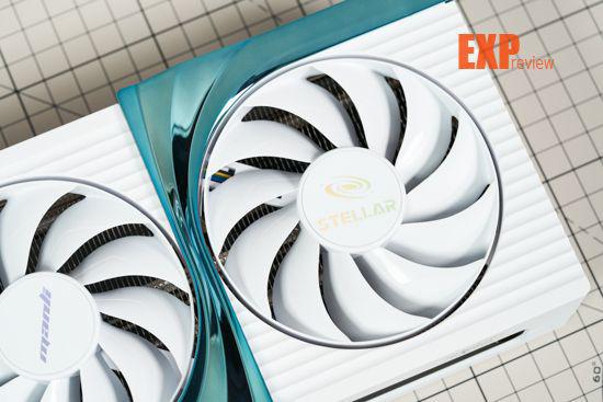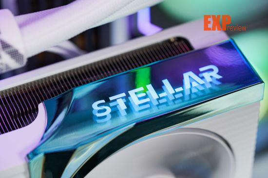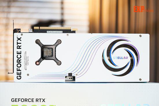 顯卡的前側同樣有電鍍件,並且可以看到整張卡都做了包圍式設計,一體感較強。在通電開機後,右邊的青色電鍍件就會亮起「STELLAR」的ARGB標誌,幽幽的光芒倒映在電鍍鏡面上,有幾分科幻電影裏設備GUI的味道,而且全顯卡就只有這一處燈效,顯得剋制而高級,不落俗套。