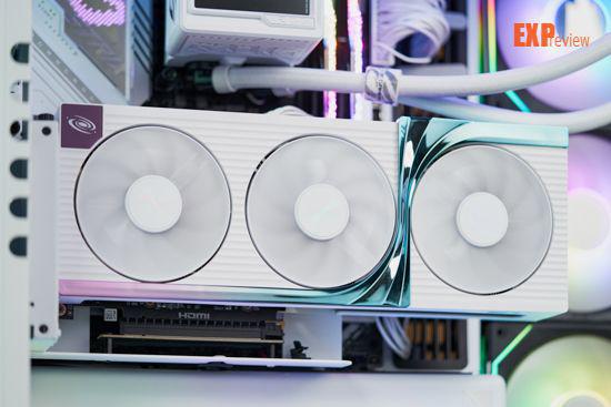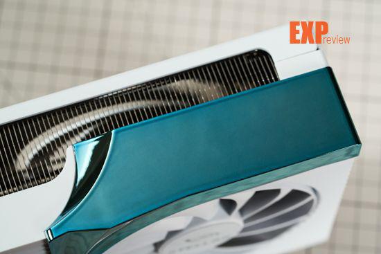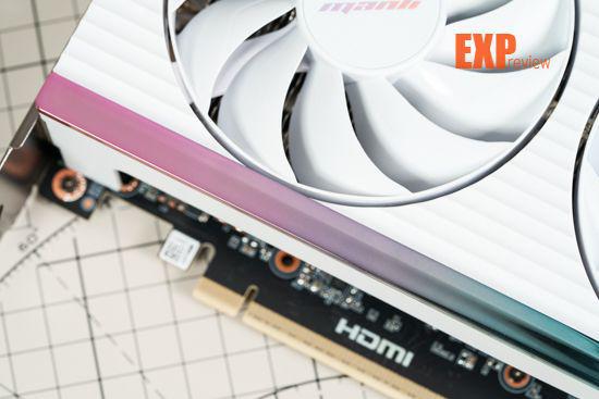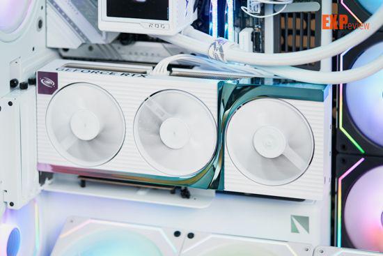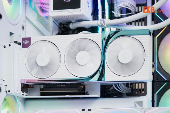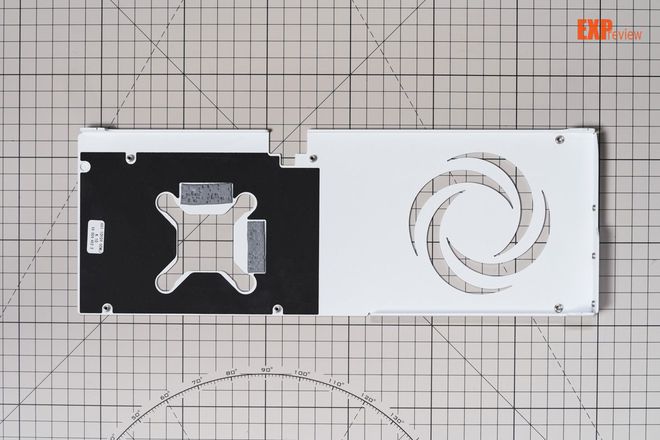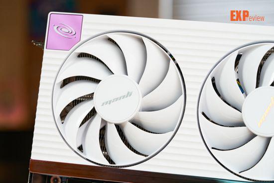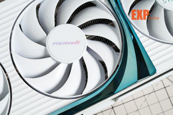 顯卡的三把90mm風扇均採用純白設計,擁有11片扇葉和環形連葉結構,仔細觀察的話就會看到扇葉裏側有微微凹陷的設計,同時扇葉末梢也有輕微上翹的處理。據萬麗介紹這樣的設計可以在保持風量和風壓的同時,使風扇氣流更加集中,還能有效防止高速旋轉時的變形。另外這風扇的轉速曲線都經過特殊調整,低轉速下也能保持不錯的散熱效率,實現更加靜音的運行效果。至於這風扇的實際表現如何,就得在後面測試裏見分曉了。