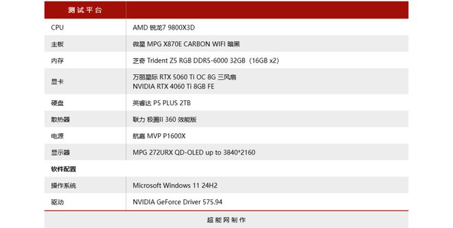 為了讓顯卡發揮出最好的遊戲性能,我們使用了銳龍7 9800X3D這款目前最好的遊戲處理器,搭配微星MPG X870E CARBON WIFI 暗黑主板,內存是芝奇 焰鋒戟 DDR5-6000 CL30 16GB*2套裝,AMD的處理器還是適合搭配低時序的6000MHz內存。由於顯存大小為8GB,所以對比顯卡我們就選擇同樣是8GB顯存的公版RTX 4060 Ti 8GB,看看星際 RTX 5060 Ti 8G能比上代同級顯卡提升多少。
