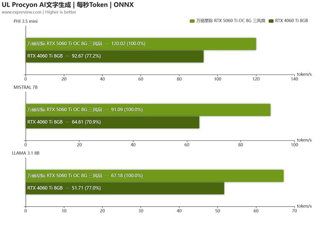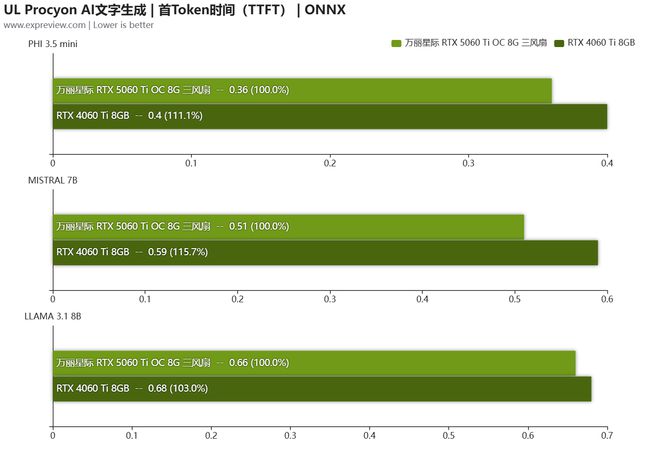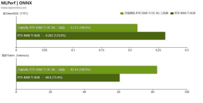 在MLPerf這些LLM測試裏面,萬麗星際 RTX 5060 Ti OC 8G對比RTX 4060 Ti 8G在生成速度上保持着不錯的領先幅度,平均下來領先幅度約為34.7%,可以說是相當明顯了,響應速度上兩張顯卡基本拉不開太大差距,差距都在0.01秒級別。