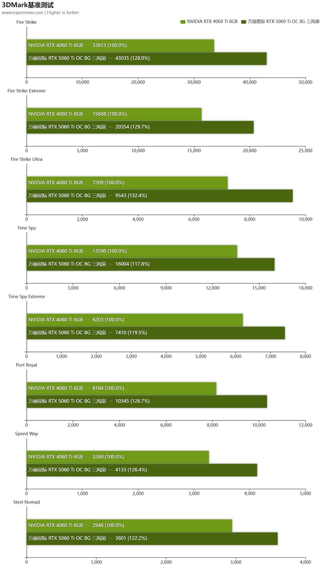 和我們之前RTX 5060 Ti 16GB的評測一樣,星際 RTX 5060 Ti 8G比RTX 4060 Ti 8GB有明顯的性能提升,其中Fire Strike系列項目平均領先幅度達到30%,Time Spy系列項目小一些,兩者平均相差18.6%;光追項目Port Royal和混合項目Speed Way中,RTX 5060 Ti 8G 星際的領先幅度幾乎一樣,分別是26.7%和26.4%。綜合算下來的話,星際 RTX 5060 Ti 8G比上代RTX 4060 Ti 8GB提升了25.3%的理論性能,提升幅度還是相當不錯的。