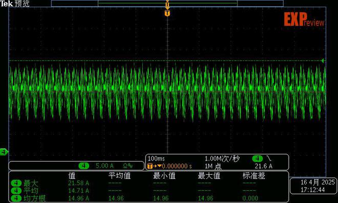 通過示波器可以看到,星際 RTX 5060 Ti 8G的最大輸入電流為21.58A,換算成功耗的話約為259W,按照這些數據來評估的話,符合ATX 3.0規範的550W電源完全可以滿足顯卡滿載運行,無需有過分的焦慮和擔心。