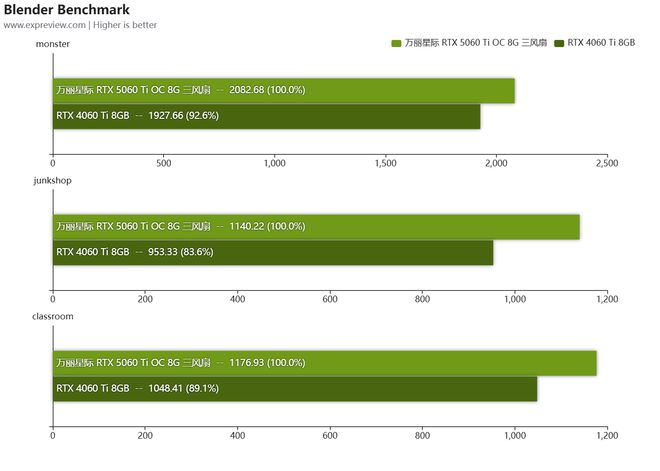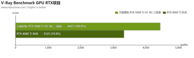 到了生產力測試環節,星際 RTX 5060 Ti 8G的領先幅度有所縮小,但平均下來也有18.3%,屬於正常的代際升級。其中領先幅度最大的是V-Ray GPU RTX項目,星際 RTX 5060 Ti 8G的領先幅度達到了33.4%。