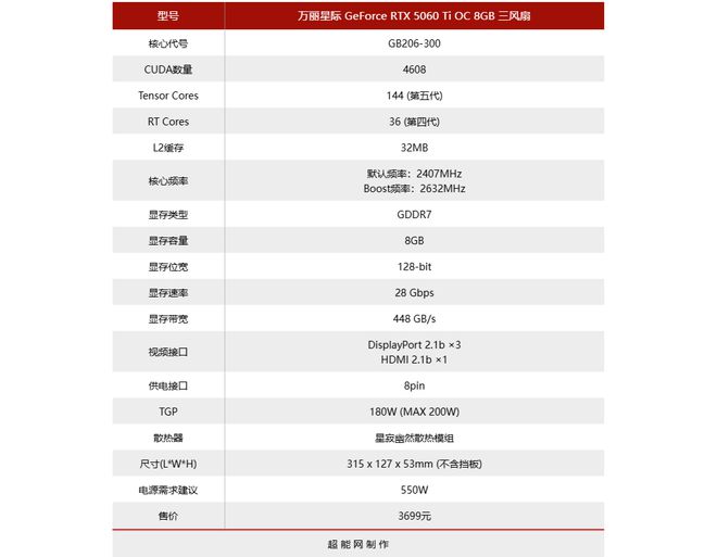 回到性能部分,萬麗星際 RTX 5060 Ti OC 8G 三風扇顯卡比起上代RTX 4060 Ti 8G有長足的進步,無論是在2K還是1080P分辨率下都能夠做到全面領先,而且在DLSS 4多幀生成技術的幫助下,暢玩2K光追遊戲完全不是問題。同時優秀的溫度和噪音表現,也讓這張顯卡幾乎沒有很明顯的缺點——不過8G顯存對於現在的遊戲而言實在有點「捉襟見肘」,想要穩定流暢地遊玩2K單機遊戲,就必須在畫質設定上花些心思了。目前這張顯卡在國內電商平臺上已上架,定價3699元,當然也有16GB版本的,定價4099元。如果你想找一款優雅、靜謐同時不失科技感的甜品級2K顯卡的話,這張RTX 5060 Ti OC 8GB 星際或許是個可以考慮的選擇。