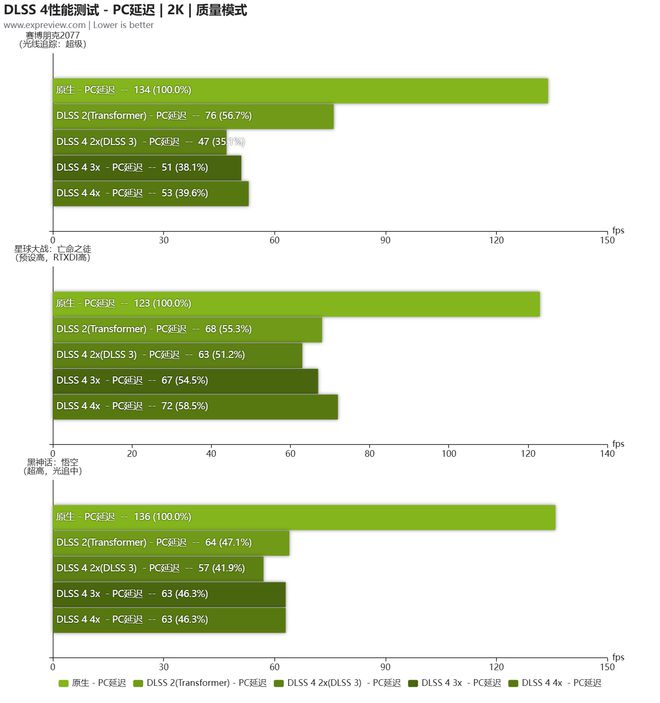 在DLSS 4的助力下,星際 RTX 5060 Ti 8G順利完成了暢玩2K光追遊戲的「任務」。開啓DLSS 4 3×檔位之後, 三個遊戲的平均幀都超過了90幀,《賽博朋克2077》和《黑神話》甚至能夠以百幀運行,比只開超分辨率的表現要好上太多。而在延遲上,開啓DLSS 4 3×檔位之後的PC延遲都比只開超分辨率要低,這要歸功於NVIDIA Reflex技術的加持,整體流暢度和操作手感都比原生分辨率好不少,後續等NVIDIA Reflex 2技術適配遊戲後應該就能很好的抵消多幀生成帶來的延遲增加問題。
